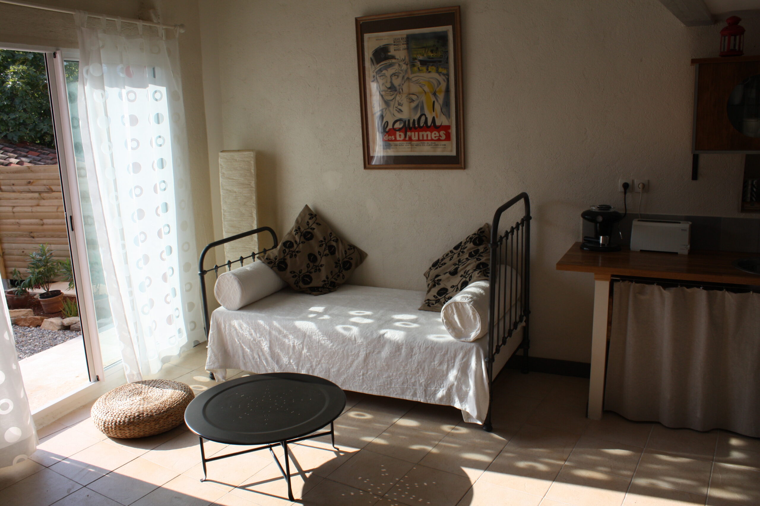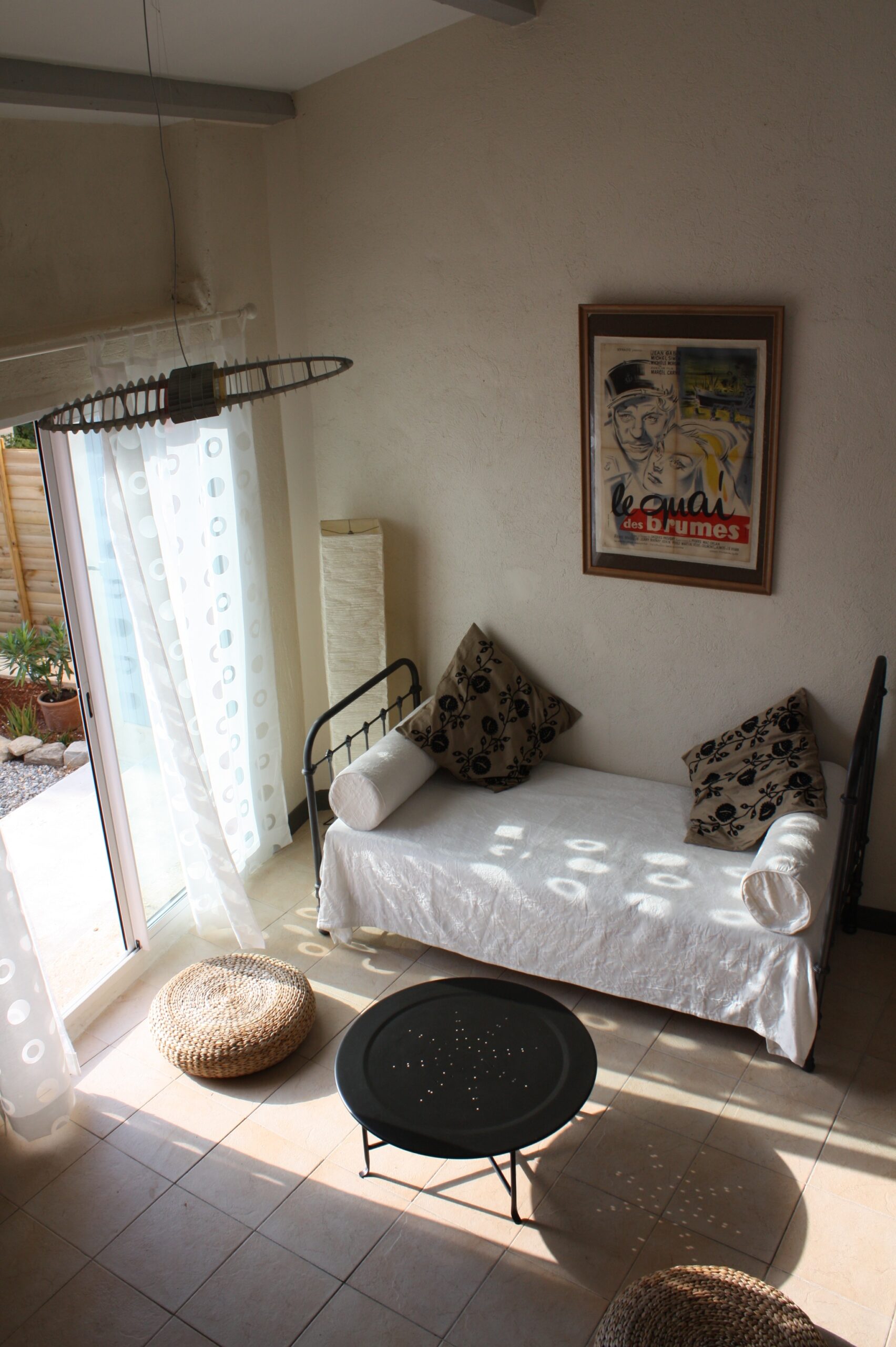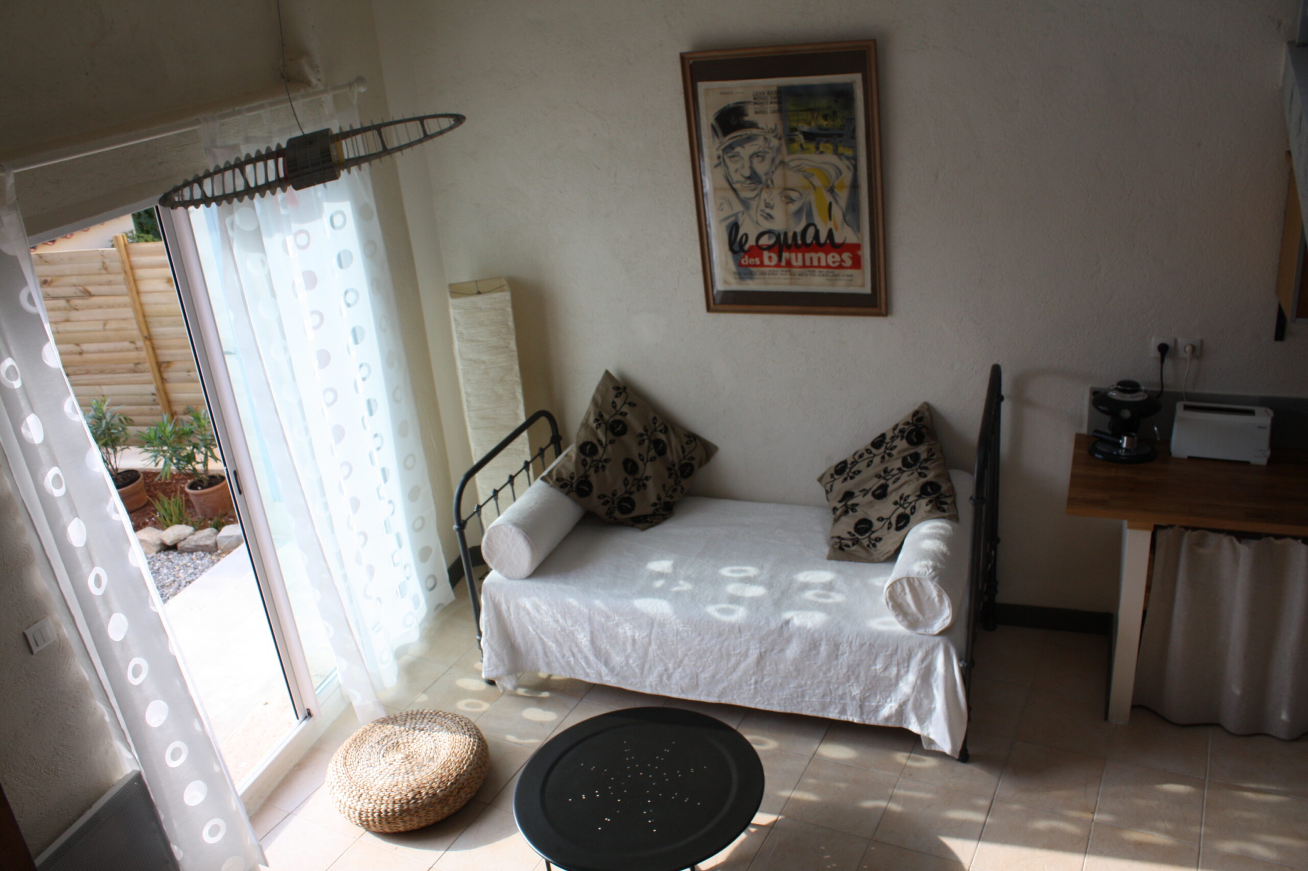 Le canapé du séjour constitue un lit de 90×190, et une banquette en fer forgé peut être montée en lit bébé avec tour en piqué de coton au besoin.