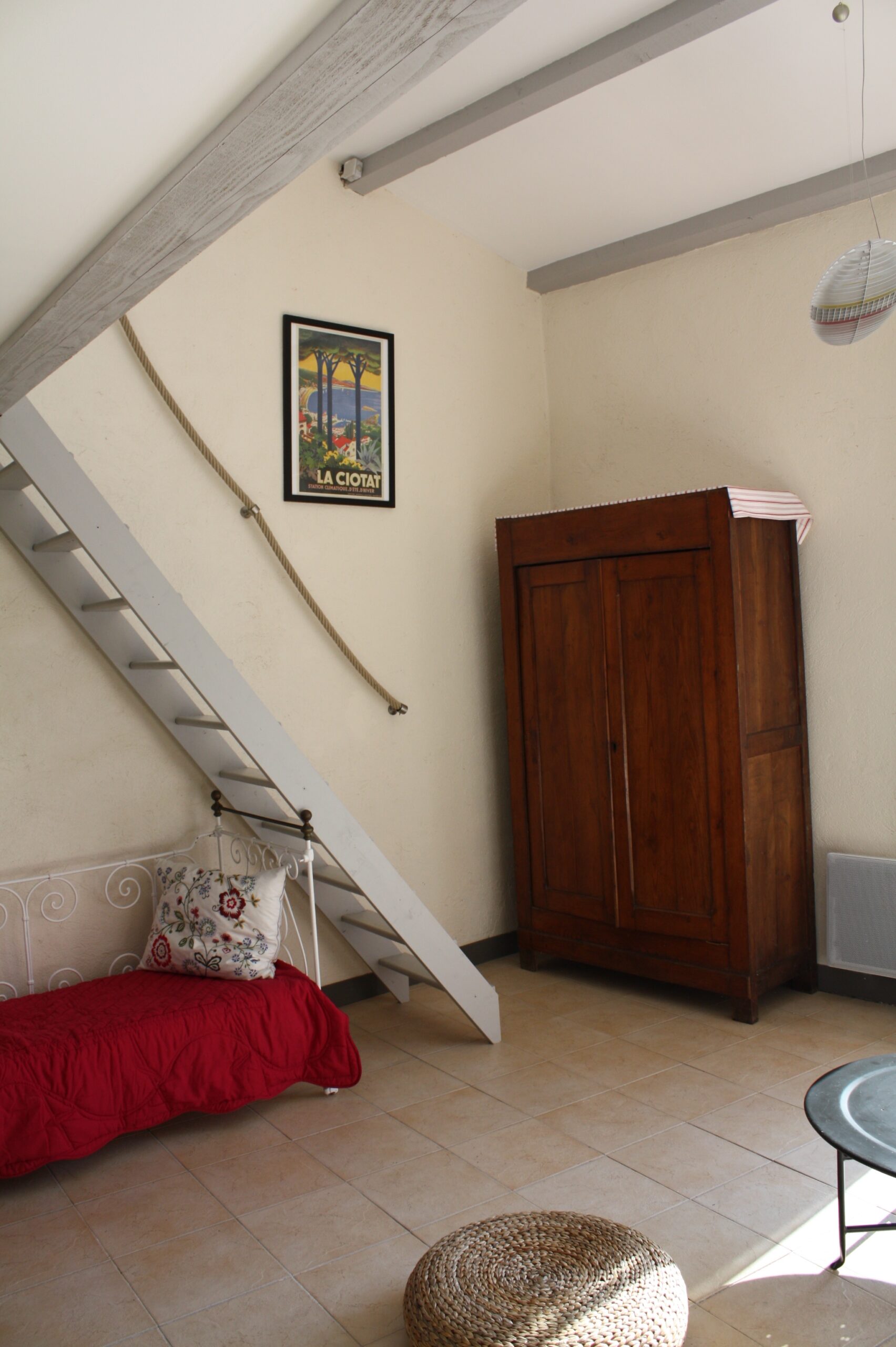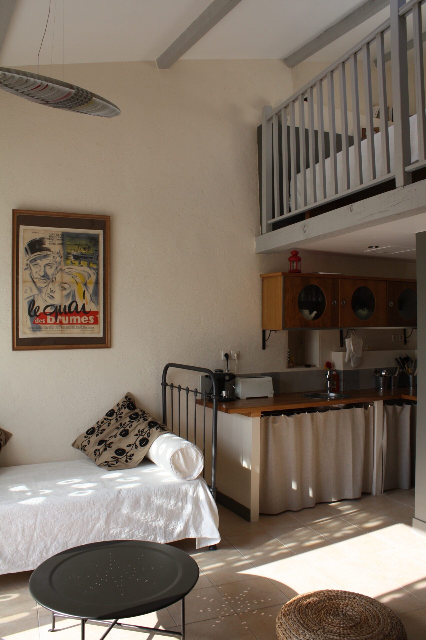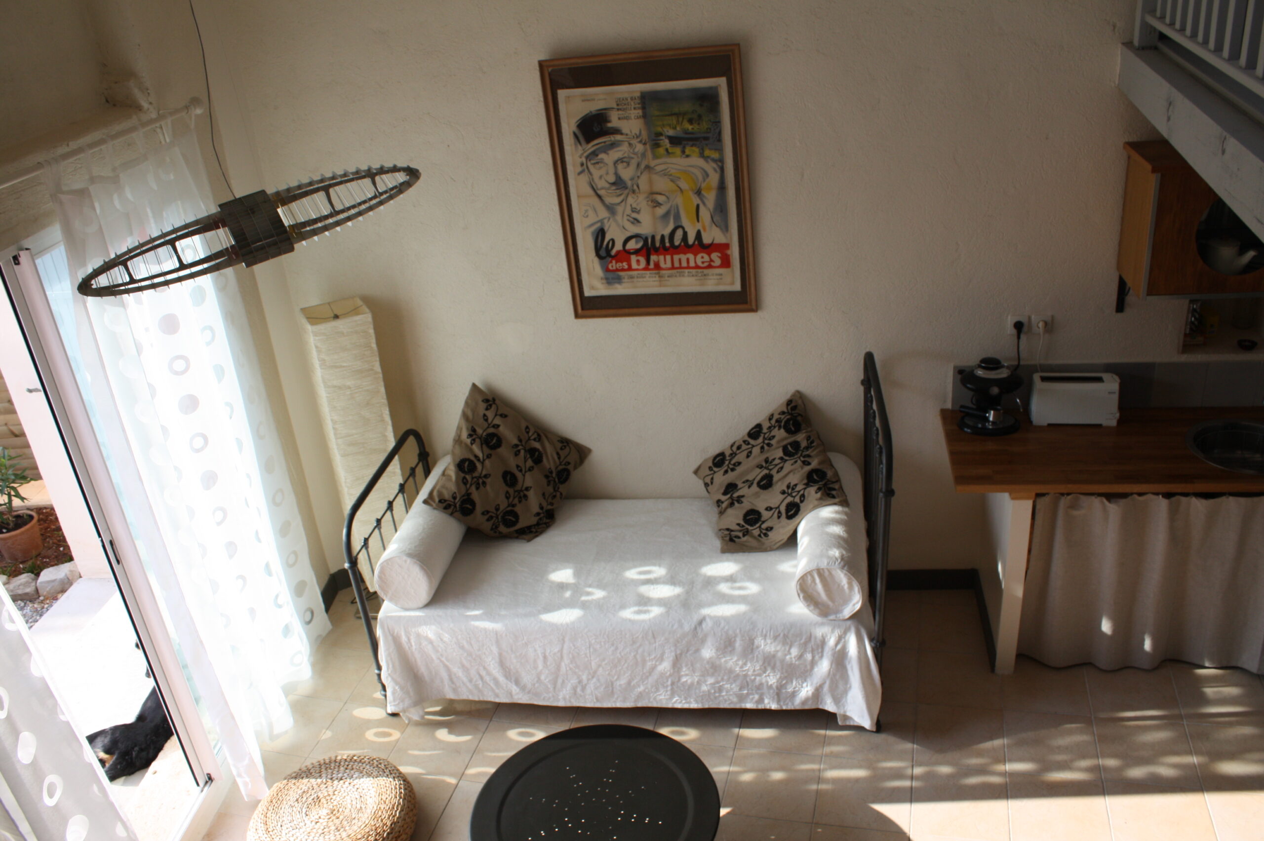 Le canapé du séjour constitue un lit de 90×190, et une banquette en fer forgé peut être montée en lit bébé avec tour en piqué de coton au besoin.